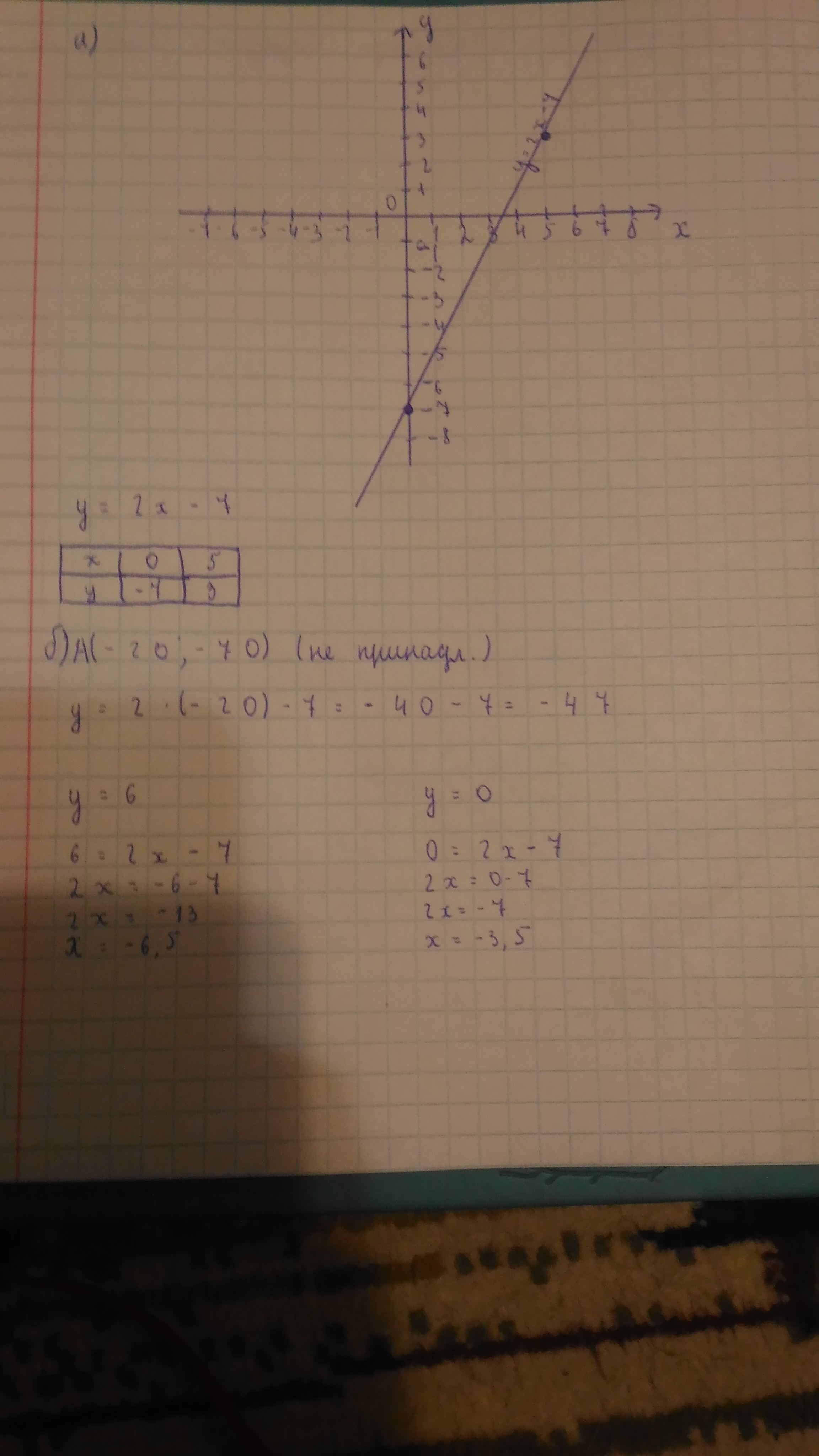 Построить график функции y=2x-7 a) принадлежит ли графику точка А(-20;-70) б)указать с помощью графика значение х, при котором у=6; у=0