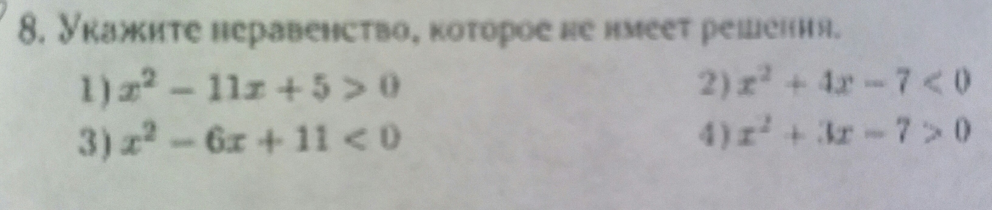 ответ 2) т.к. Д <0, ветви вверх, а это значит, что пересечения с осью х нет, и меньше 0 значений соответственно тоже нет.