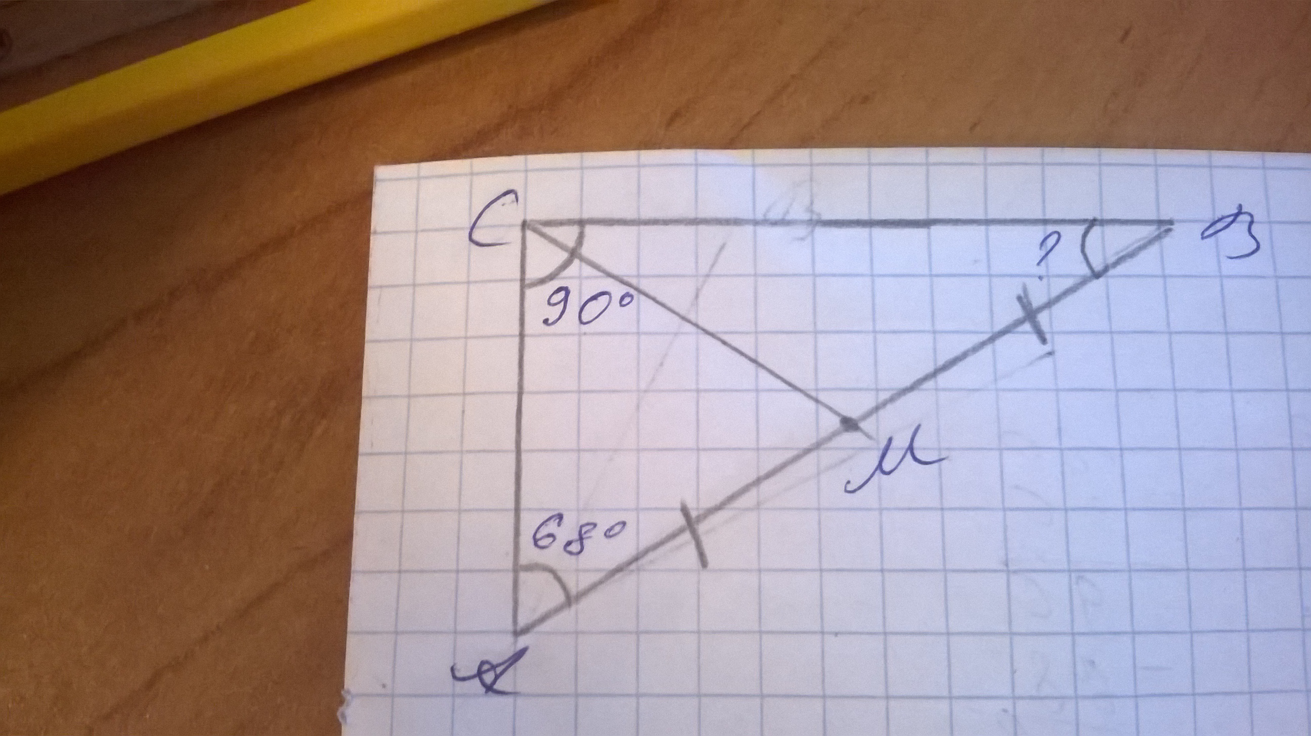 В треугольнике ABC проведена медиана CM. Известно, что CM=MB, угол CAM=68 градусов, угол ACB = 90 градусов. Найдите угол MBC. срочно надо 7 класс