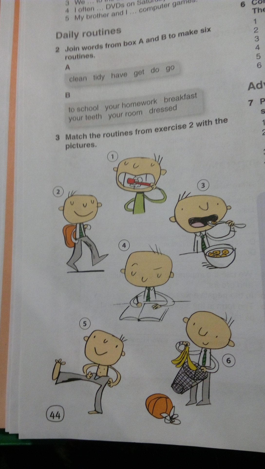1- clean your teeth; 2-go to school; 3- have breakfast; 4- do homework; 5- get dressed; 6- tidy your room