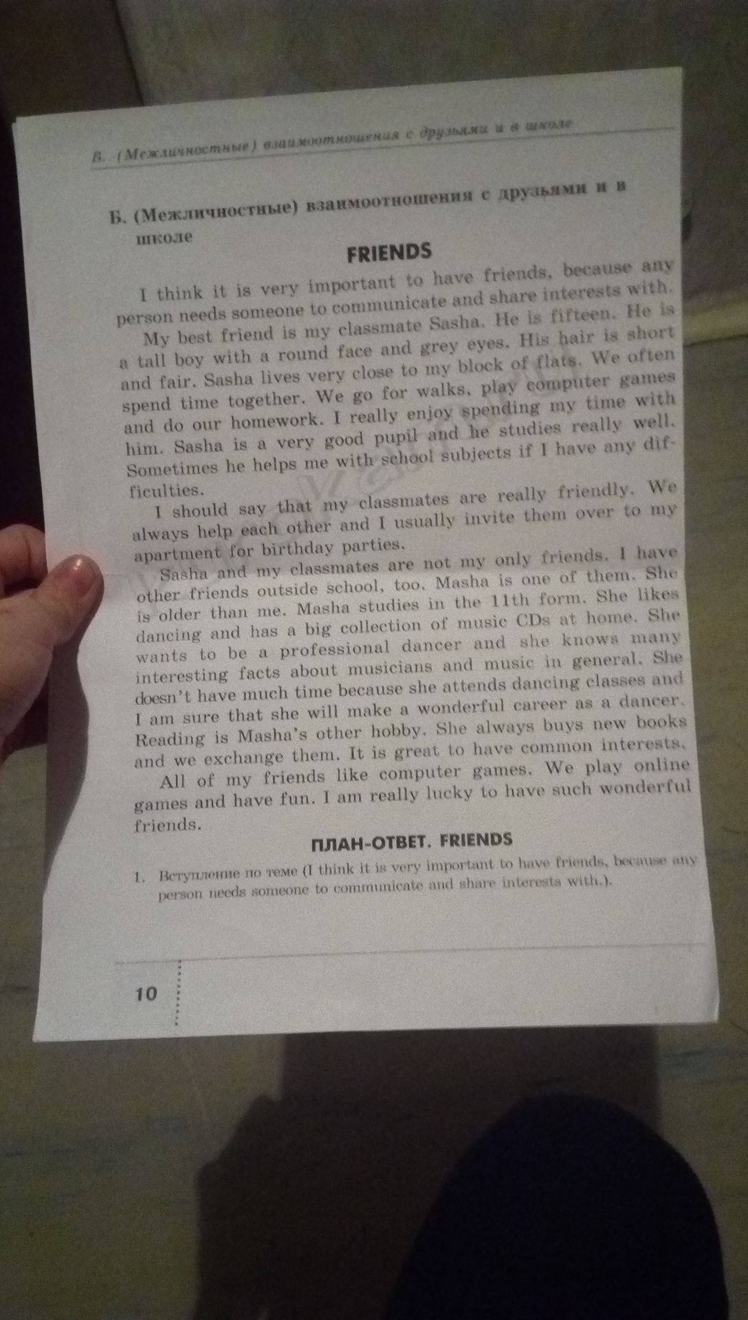 Я думаю, очень важно иметь друзей, потому что любой человек должен кем-то общаться и делиться с интересы.Мой лучший друг-это мой одноклассник Саша. Он составляет 15 лет. Он является высокий мальчик с круглым лицом и серыми глазами. Его волосы короткие и справедливые. Саша живет очень недалеко от моего жилого дома. Мы часто проводим время вместе. Мы идем гулять, играть в Компьютерные игры и делать домашнее задание. Я действительно нравится тратить свое время с ним. Саша — очень хороший ученик и он учится очень хорошо. Иногда он помогает мне с школьным предметам, если у меня есть какие-либо трудности.Я должен сказать, что мои одноклассники являются очень дружественными. Мы всегда помогаем друг другу, и я обычно пригласить их в мою квартиру на дни рождения.Саша и мои одноклассники не являются мои единственные друзья. У меня есть другие друзья вне школы, тоже. Маша является одним из них. Она старше меня. Маша учится в 11 классе. Она любит танцы и имеет большую коллекцию музыкальных компакт-дисков на дому. Она хочет быть профессиональным танцором, и она знает много интересных фактов о музыкантов и музыку в целом. Она не имеет много времени, потому что она посещает танцевальные классы, и я уверен, что она будет делать замечательные карьеру в качестве танцовщицы. Чтение это Маши другие хобби. Она всегда покупает новые книги и мы обменять их. Это здорово иметь общие интересы.Все мои друзья любят компьютерные игры. Мы играть в игры онлайн и получайте удовольствие. Я действительно повезло, что есть такие замечательные друзья.