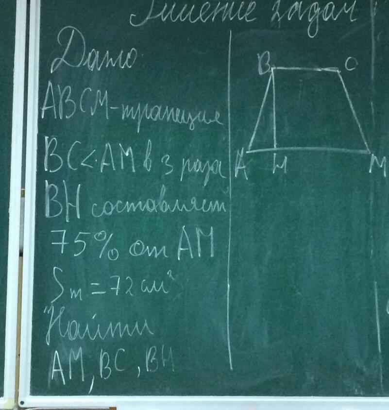 Пусть меньшее основание х, тогда большее 3х, а высота равна 0,75*3х. Уравнение: