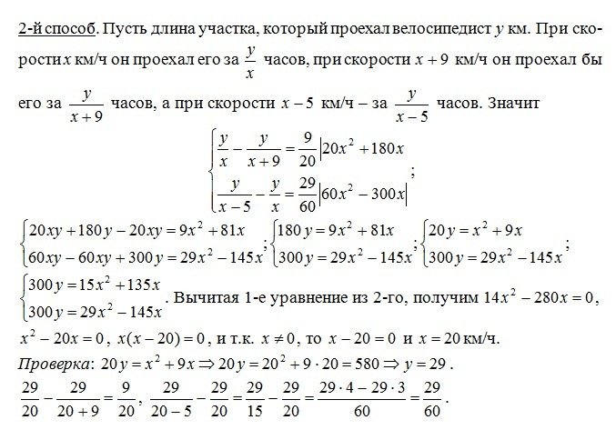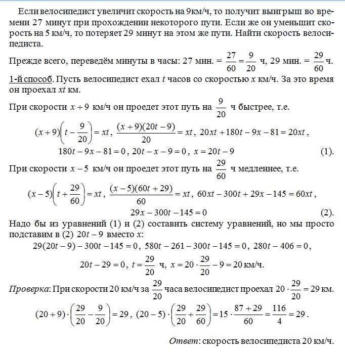 если велосипедист увеличит скорость на 9км/ч ,то получит выигрыш во времени 27 минут при прохождении некорого пути.Если же он уменьшит скорость на 5 км/ч, то потеряет 29 минут на этом же пути. найти скорость велосипедиста.