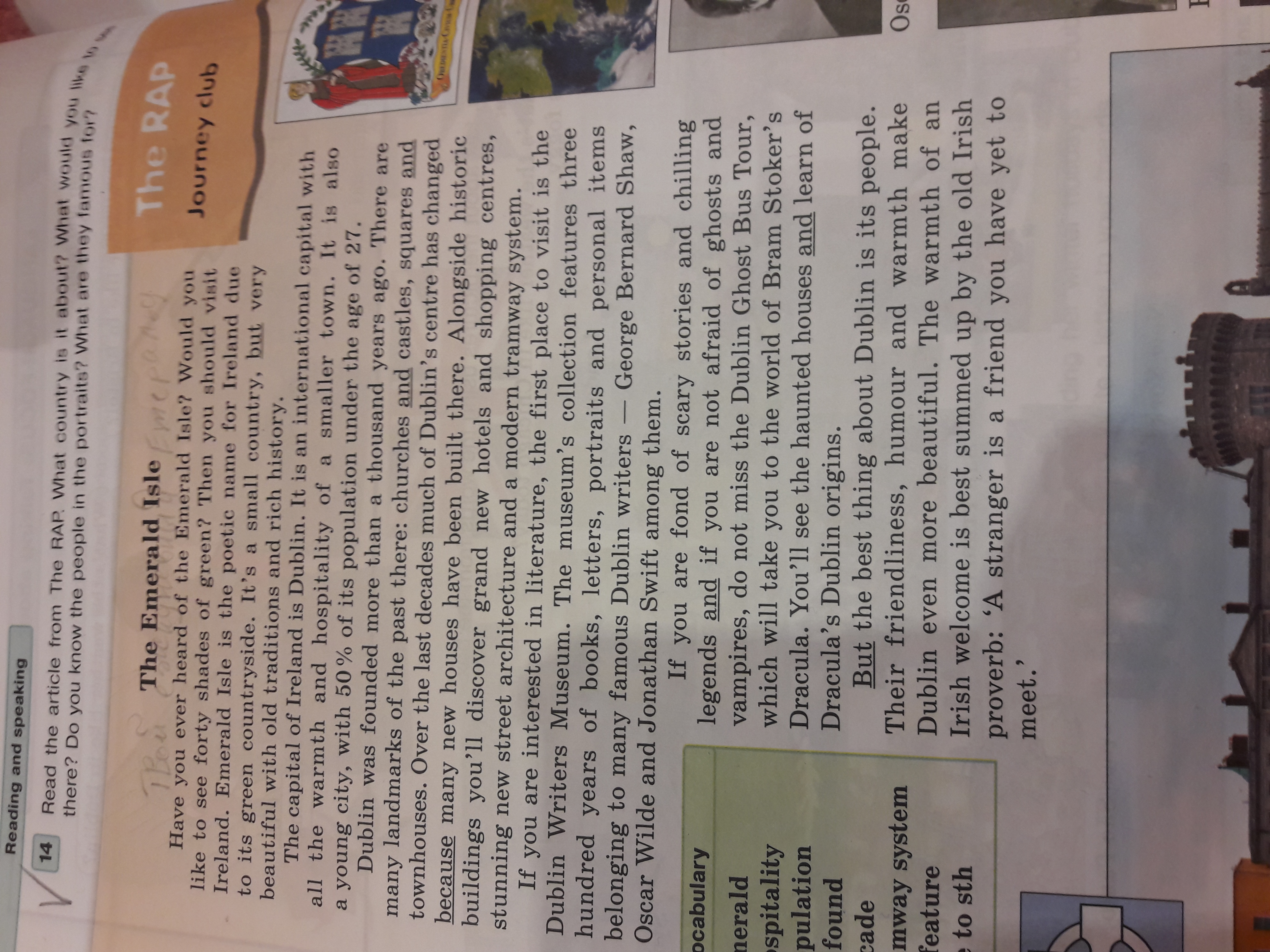 Вы когда-нибудь слышали о Изумрудном острове? Хотите посмотреть сорок оттенков зеленого? Тогда вы должны посетить Ирландию. Изумруд-это поэтическое название Ирландии из-за его зеленой загородной местности. Это маленькая страна, но очень красивая с вековыми традициями и богатой историей. Столица Ирландии-Дублин. Это международный капитал, со всей теплотой и гостеприимством в маленьком городке. Это еще молодой город, с 50% населения в возрасте до 27 лет. Дублин был основан более тысячи лет назад. Есть много памятников прошлого: церкви и замки, площади и дома. За последние десятилетия значительная часть центра Дублина была изменена, потому что много новых домов были построены там. Наряду с историческими зданиями вы найдете большинство новых отелей и торговых центров, солнечная улица,новая архитектура и современные трамвайные системы. Если вы заинтересованы в литературе, первое место, чтобы посетить Дублин-музей писателей коллекции музеев триста лет ,книги, письма, портреты и личные вещи многих известных Дублинских писателей - Джордж Бернард Шоу, Оскар Уайльд и Джонатан Свифт среди них. Если вы любите страшные истории и леденящие кровь легенды, и если вы не боитесь призраков и вампиров, не пропустите Дублин Призрак автобусный тур, который доставит вас в мир Дракулы Брэма Стокера. Вы увидите дома с привидениями и узнаете о происхождении Дракулы Дублина. Но самое лучшее в Дублине-это люди. Их дружелюбие, юмор и теплота делают Дублин еще более красивым. Теплое ирландское гостеприимство наилучшим образом подытожила старая ирландская пословица: "Стангер-это друг, тебе еще предстоит познакомиться"