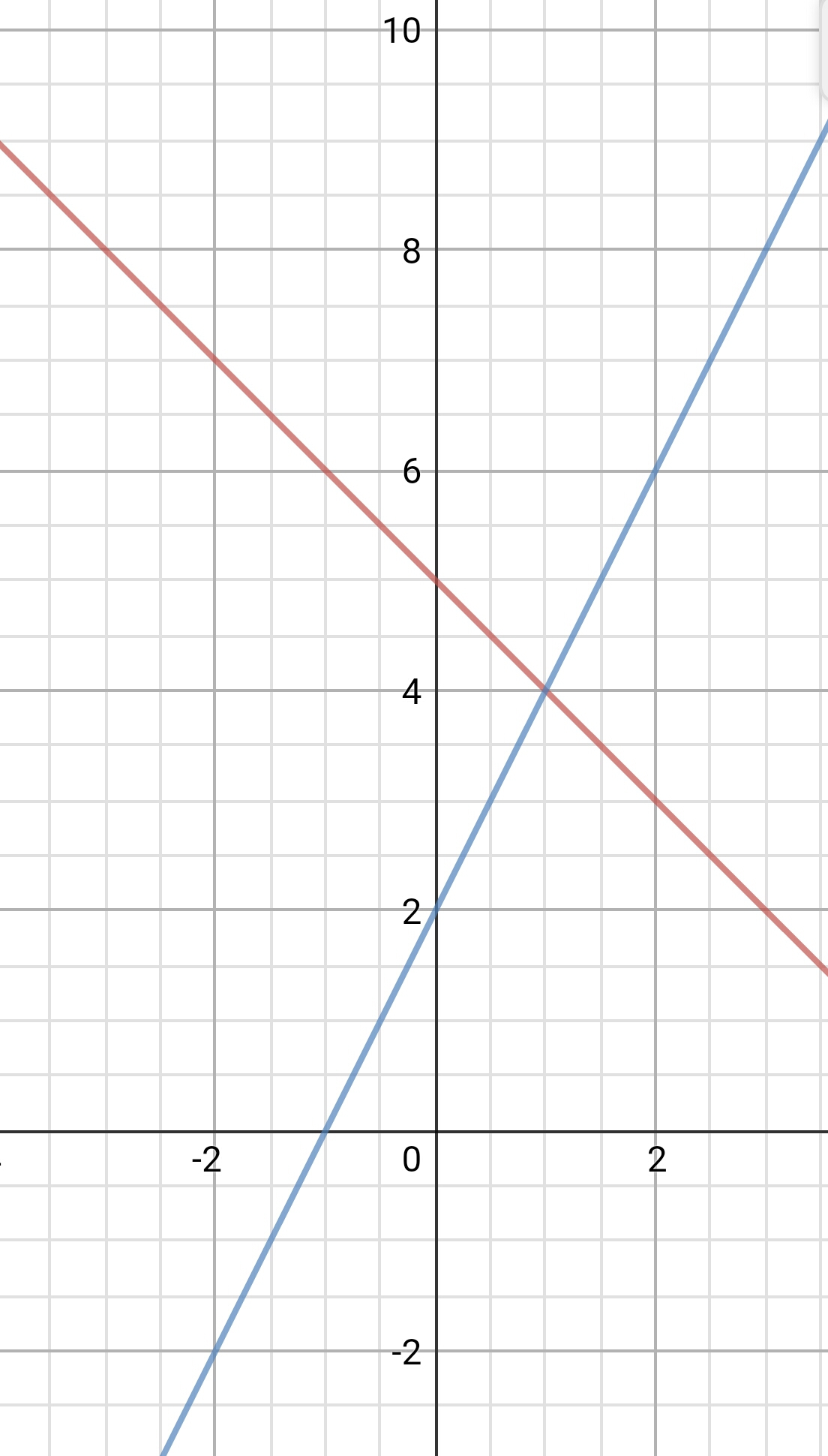 выражаем у из 1 уравния: y=5-x, 2 уравнение уже функция, для графика нужны две точки, берем любые значения х и по ним находим у и чертим график: 1 решение: (1;4)