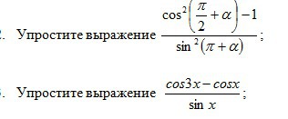 frac{cos^2(frac{pi}{2}+ alpha )-1}{sin^2(pi + alpha )} = frac{sin^2 alpha -1}{sin^2 alpha } = frac{-cos^2 alpha }{sin^2 alpha } = -ctg^2 alpha \\\frac{cos3x-cosx}{sinx} = frac{-2sin2xcdot sinx}{sinx} =-2sin2x