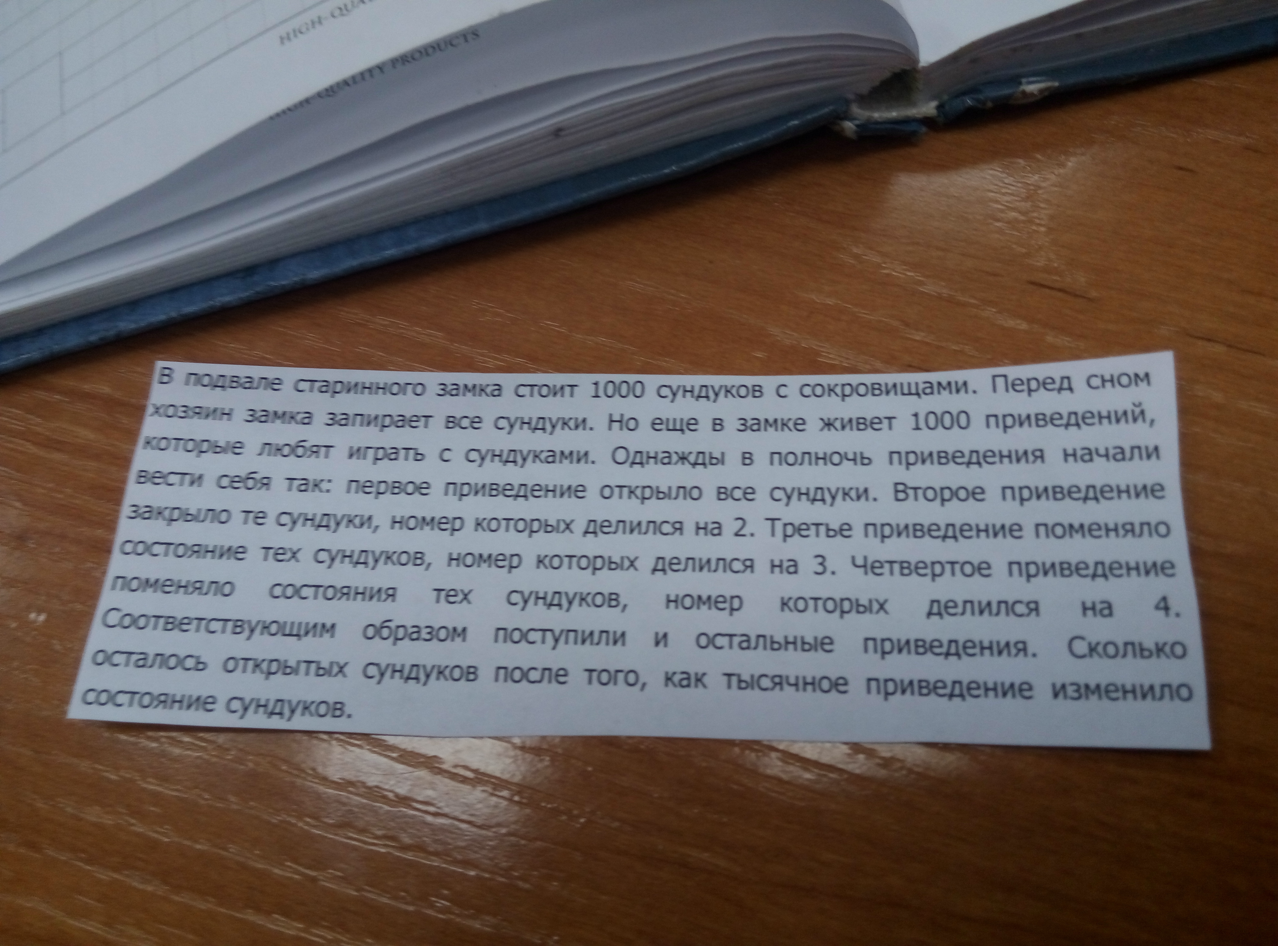 Т.к. j-ое привидение меняет состояние сундуков с номерами кратными j, то k-ый сундук будет менять свое состояние столько раз, сколько есть делителей числа k меньших 1000. Поэтому после 1000-го приведения, k-ый сундук останется открытым, если количество его делителей будет нечетным числом. Если