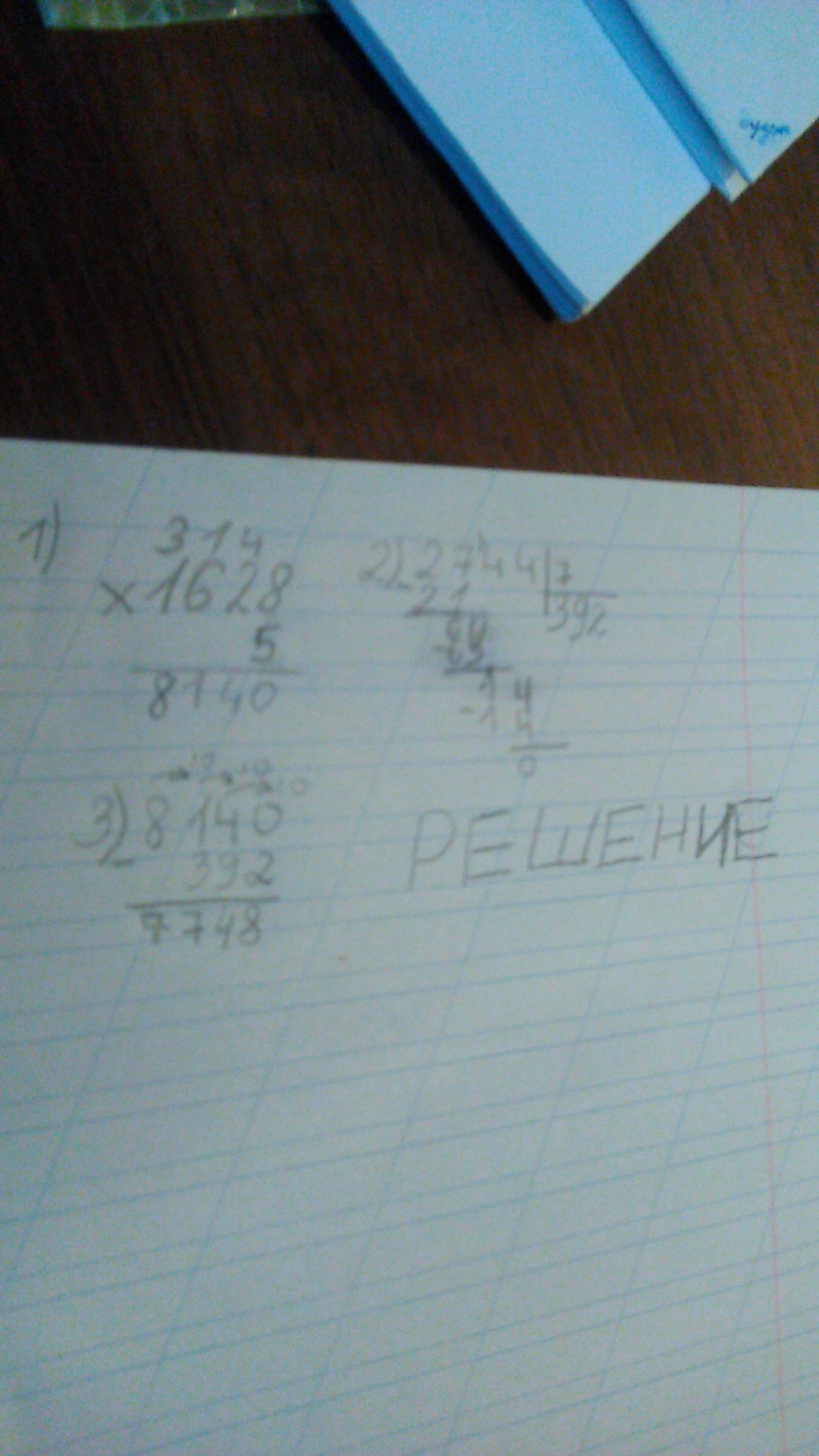 Из произведения чисел 1628 и 5 вычесть частное чисел 2744 и 7