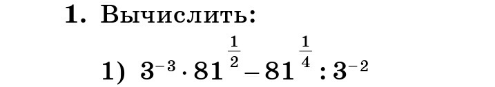 3^{-3}cdot 81^{frac{1}{2}}-81^{frac{1}{4}}:3^{-2}=frac{1}{3^3}cdot (3^4)^{frac{1}{2}}-(3^4)^{frac{1}{4}}:frac{1}{3^2}=\\=frac{3^2}{3^3}-frac{3}{frac{1}{3^2}}=frac{1}{3}-3cdot 3^2=frac{1}{3}-27=frac{1-81}{3}=-frac{80}{3}