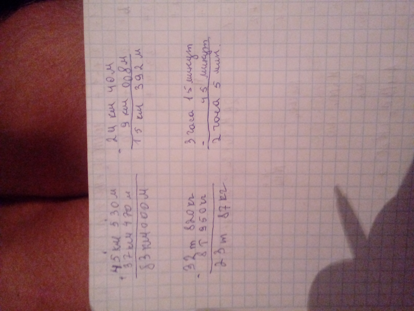 Запиши вычисления столбиком. 45 км. 530 м. + 37 км. 470 м. = 24 км. 40 м. - 9 км. 008м.= 32 т. 820 кг. - 8 т. 950 кг. = 3 часа 15 минут - 45 минут =