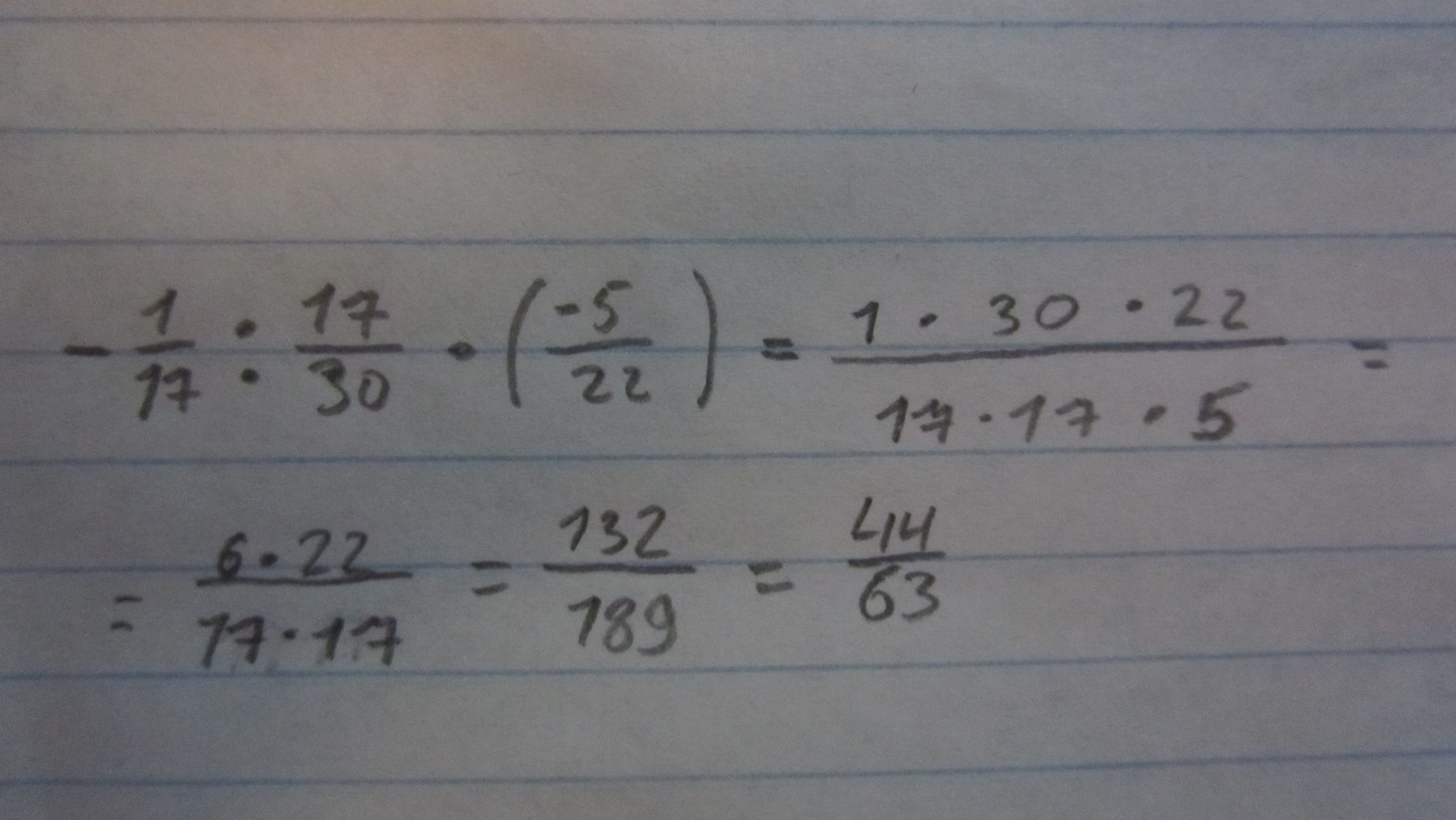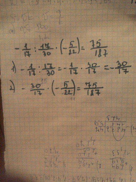 чтобы умножить дроби, нужно умножить числители и знаменатели. по возможности (как во 2м действии) числа сокращаются, если делятся на одно и то же число. сокр можно только числитель и знаменатель накрест, если они не под одной чертой. в данном случае 30 и 22 делятся на , значит они сокращаются и будет 15 и 11.