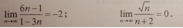 (6n-1) / (1-3n) = (вынесем n за скобку в числителе и знаменателе) = (n(6 - 1/n)/(n(1/n - 3)) = (1/n бесконечно малая и стремится к 0 при n стремящимся к бесконечности, а вынесенные n сокразаются) = 6/ -3 = -2