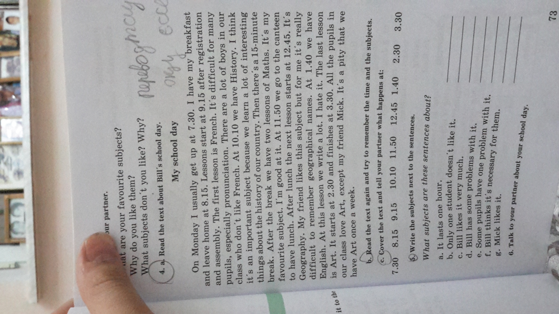 в понедельник я обычно просыпаюсь в 7.30. я завтракаю и выхожу из дома в 8.15. уроки начинаются в 9.15, после регистрации и сборов. первый урок французский язык. он является тяжелым для многих, особенно произношение. есть много мальчиков ,в нашем классе, которые не любят французский. в 10.10 у нас история. я думаю, что это важный предмет, потому что мы изучаем много вещей об истории нашей страны. потом 15 минут перемена. после перемены у нас два урока математики. это мой любимый предмет. я успешно в нем. в 11.50 мы идем в столовую и едим свой ланч после ланча следующий урок начинается в 12.45. это география. мой друг любит этот предмет, но для меня это вправду тяжело запомнить географические названия. в 1.40 у нас английский. на этом уроке мы много пишем. я ненавижу это. последний урок искусство. он начинается в 2.30 и кончается в 3.30. все ученики в нашем классе любят искусство, особенно мой друг Майк .жалко, что мы имеем урок искусства только раз в неделю