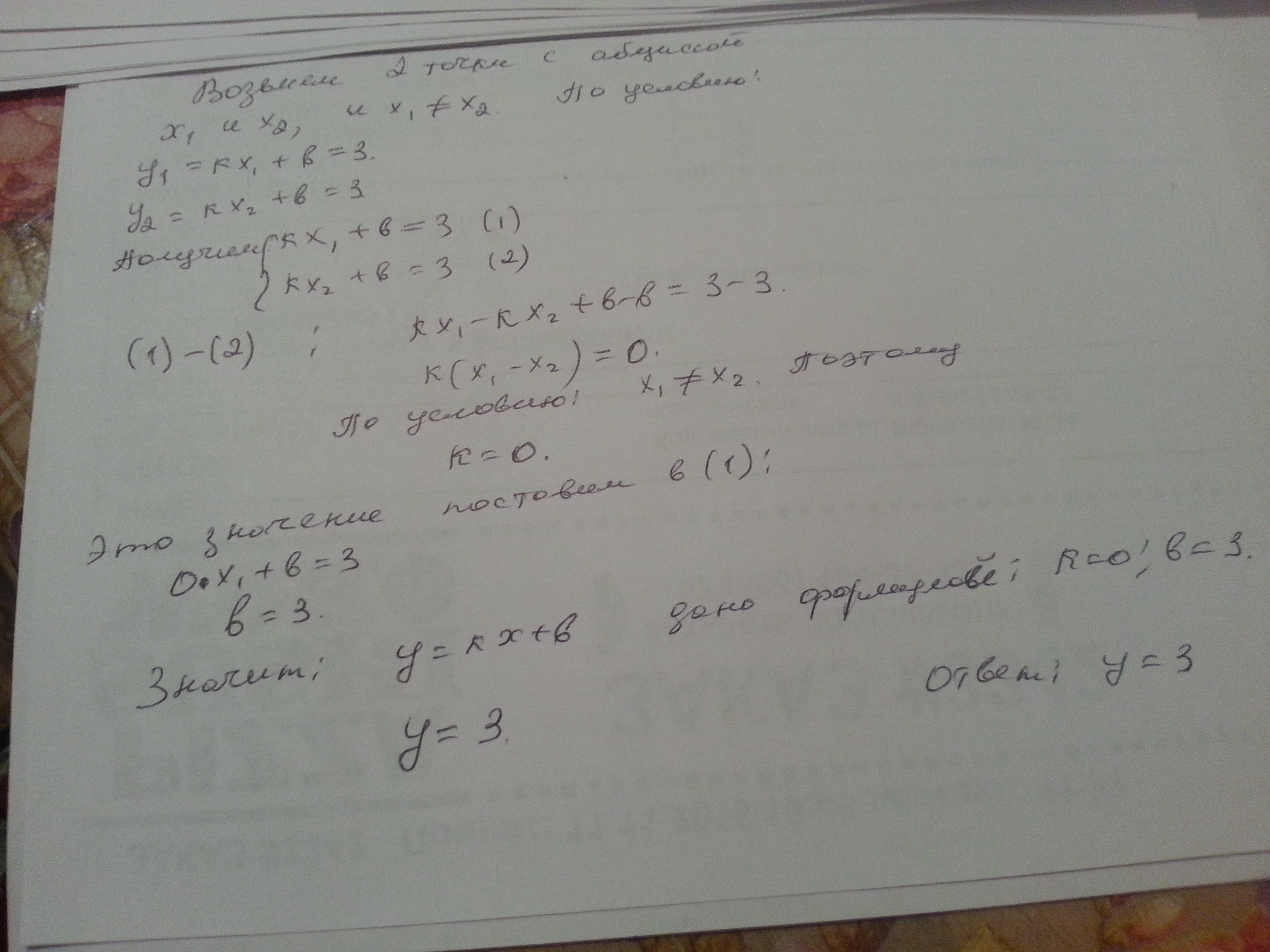 График функции представляет сосбой прямую параллельную оси ОХ. Ответ: К=0, в=3