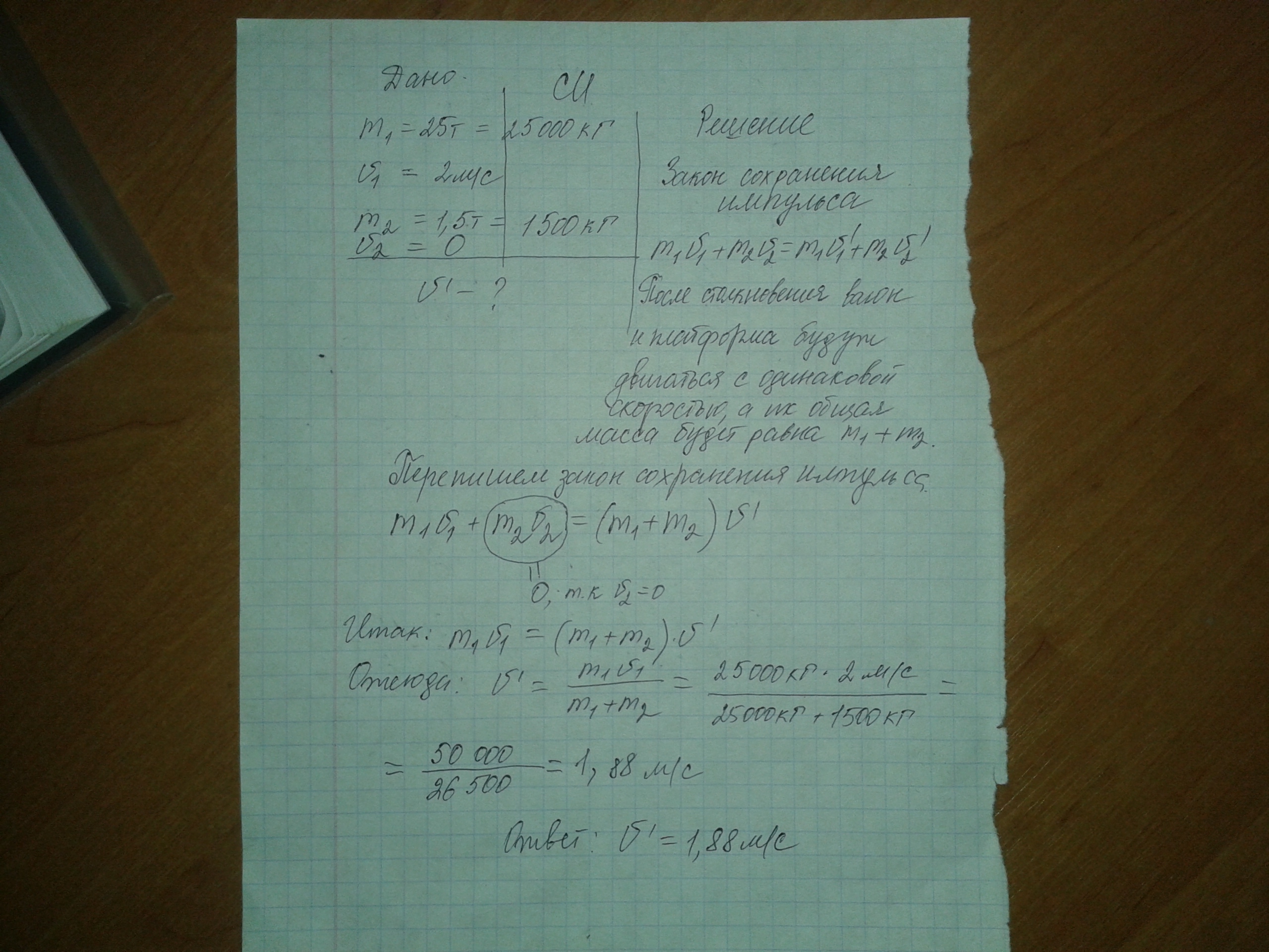 Вагон, масою 25 т, рухається зі швидкістю 2 м/с і зустрічає на шляху нерухому платформу масою 1.5 т. Після зіткнення вагон і платформа рухаються разом. Знайдіть швидкість їхнього руху.