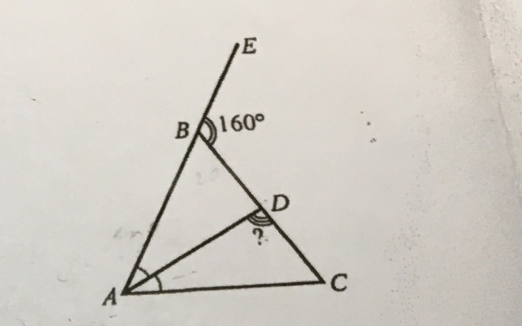 Итак, Дано: AB=BC ; угол BAD = углу DAC ; угол EBC= 160 градусов.