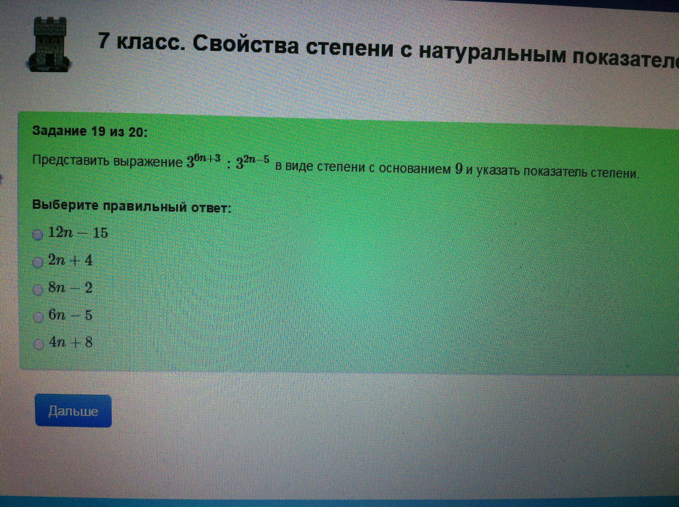 3^{6n+3}:3^{2n-5}=3^{6n+3-2n+5}=3^{2(2n+4)}=9^{2n+4}