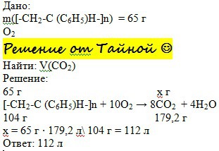 Найдите, какой объём(л) занимает при нормальных условиях углекислый газ, полученный при полном сгорании 65г полистерола