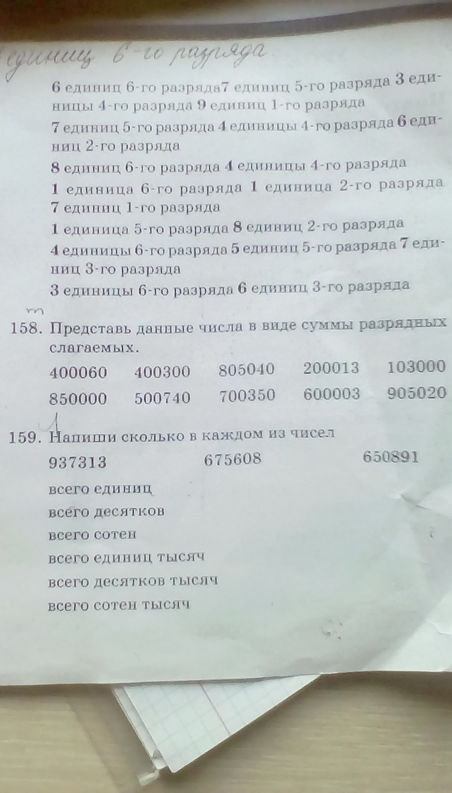 если номер 159 тогда вот ответы в 1 числе 9 сот тысяч 3 десятка тысяч 7 тысяч 3 сотни 1 десяток и 3 единицы во втором 6 сотен тысяч 7 десятков тысяч 5 тысяч 6 сотен 0 десятков 8 единиц в третьем 6 сотен тысяч 5 десятков тысяч 0 тысяч 8 сотен 9 десятков 1 единица