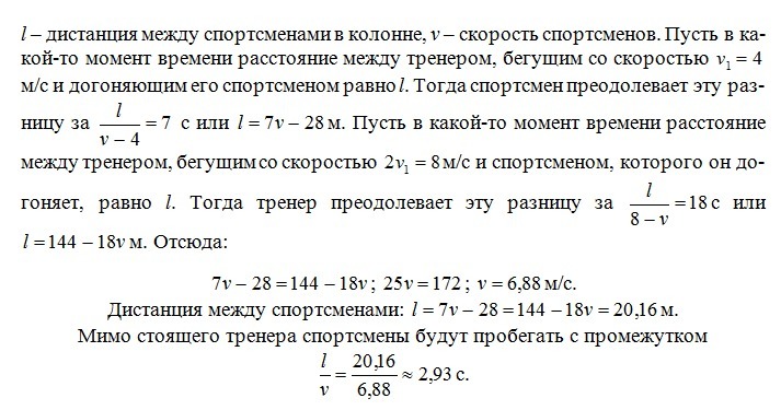 По дорожке стадиона равномерно бежит колонна спортсменов. Дистанция между ними одинакова. Бегущий по дорожке в том же направлении тренер обнаружил, что если его скорость равна V1=4 м/с, то через каждые 7 c его обгоняет спортсмен из колонны, а при скорости тренера в два раза больше уже тренер каждые 18 с обгоняет спортсмена из колонны. Найдите: 1) Скорость спортсменов колонне (в м/с с точностью до сотых); 2) Дистанцию между спортсменами в колонне (в метрах с точностью до сотых); 3) Через какой промежуток времени будут пробегать спортсмены мимо стоящего тренера (в секундах с точностью до сотых)?