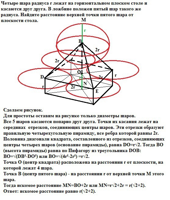 лежат 4 шара. Точка В (центр пятого шара) - на расстоянии r от верхней точки М этого шара. Тогда искомое расстояние MN=BO+2r или MN=r√2+2r = r(√2+2).