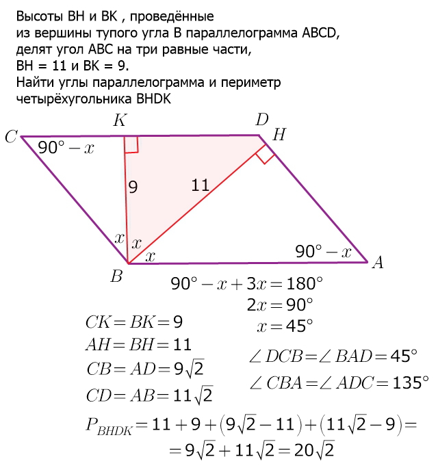 7(6). Высоты BH и BK , проведённые из вершины тупого угла B па- раллелограмма ABCD, делят угол ABC на три равные части, BH 11 и BK 9 . Найти углы параллелограмма и периметр четырёхугольника BHDK