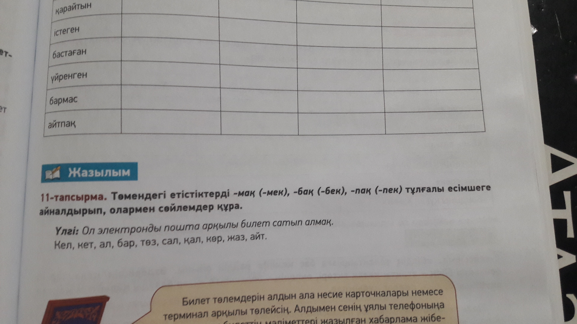Олар жаяу келмек.Анам ауылға кетпек.Досым алматыға бармақ.Ол ауылға төзбек.Ол малға жем салмақ.Əпкем қалада қалмақ.Ол кино көрмек.Ағам ереже жазбақ.Інім жаттау айтпақ.