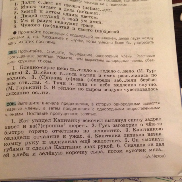 Номер 206 и выпишите какие однородные члены в предложениях. Надо только с второстепенными. Срочно!!(определение, обстоятельство, дополнение)