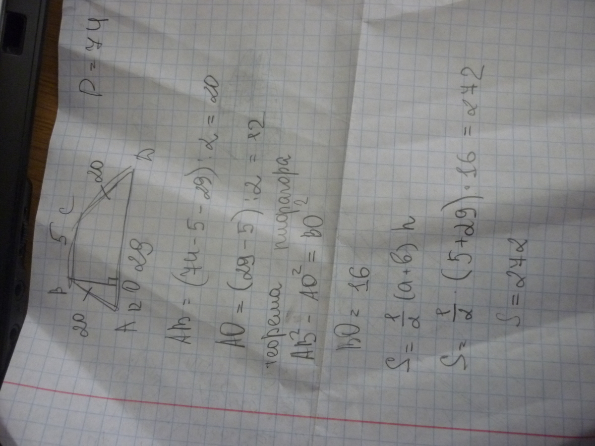 1) (74-(5+29)) : 2 =20 -стороны трапеции