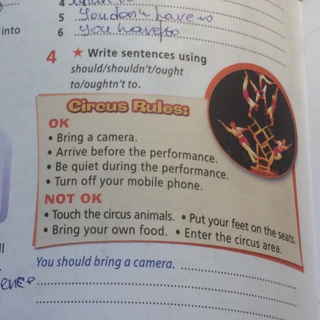 You shouldn't touch the cirsuc animals. You oughtn't to put your feet on the seats. You shouldn't bring your own food. You oughtn't to enter the cirsuc area.