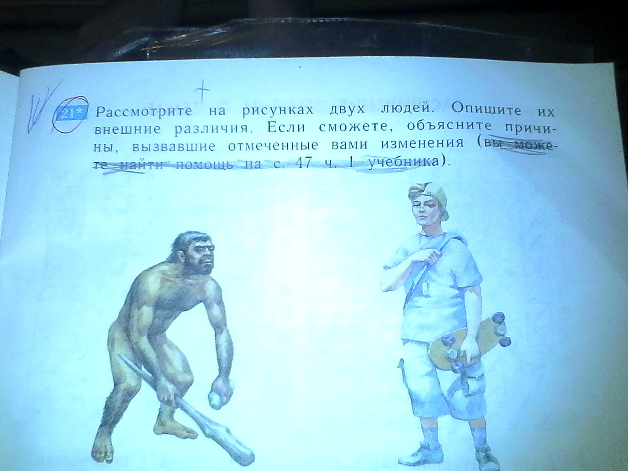 Человек справа современный,это можно заметить по одежде и по предметам. Человек слева древний и не ухоженный,это объясняет его время проживания.