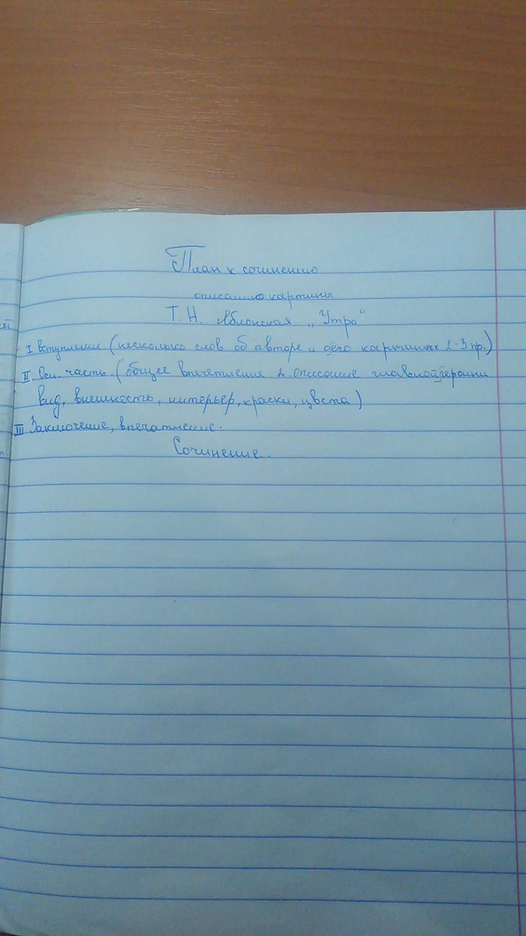 Перед нами – картина «Утро». На ней изображено раннее ясное весеннее утро. Солнечные лучи врываются в комнату через окно и открытые двери балкона и падают на стул, стол, пол, кровать. Вся комната наполнена свежим воздухом.