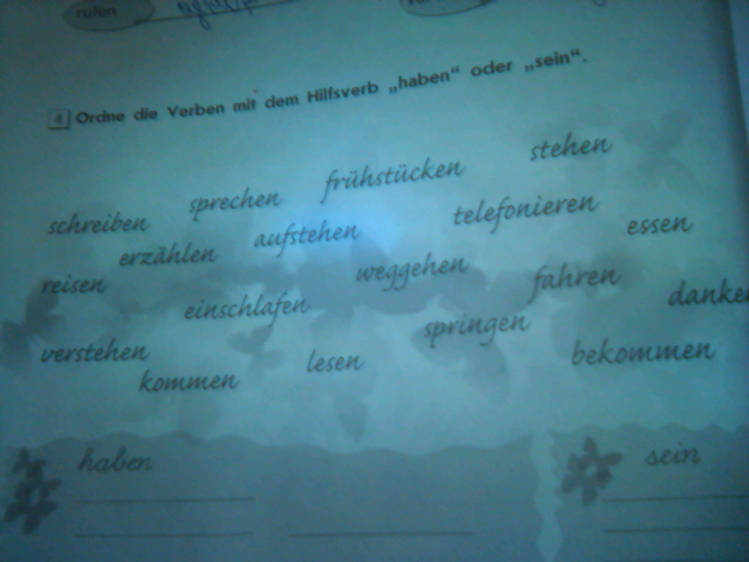 haben-schreiben, sprechen, frühstücken, stehen, erzählen, telefonieren, essen, lesen, danken