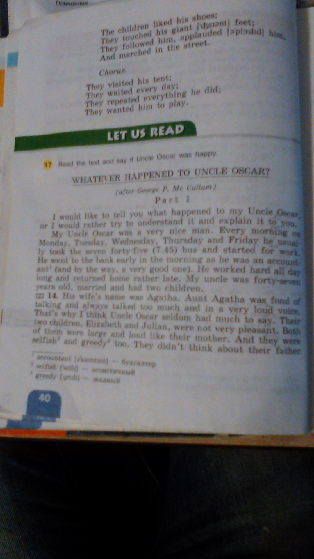 Я хотел бы рассказать вам, что случилось с дядей Оскаром, или даже я скорее постараюсь понять это и объяснить вам. Мой дядя Оскар был очень приятным человеком. Каждое утро в понедельник, вторник, среду, четверг и пятницу он обычно садился на (7.45) автобус и ездил на работу. Он приезжал к банку рано утром, так как он был бухгалтером (и кстати, очень хорошим). Он усердно работал целыми днями и возвращался домой довольно поздно. Моему дяде было сорок семь лет, он был женат и у него было двое детей. Его жену звали Агата.Тетя Агата любила поболтать и всегда разговаривала слишком много и очень громко . Вот почему я думаю, дядя Оскар редко говорил. Двое их детей, Элизабет и Джулиан, были не очень приятными. Оба они были здоровые и громкие (громкоголосые ), как их мать. И они также были эгоистичными и жадными. Они не думали о своем отце. Он был маленький , тихий человек, который мало говорил и не жил свою жизнь незаметно. Он любил музыку, но не играл ни на фортепиано, ни на скрипке, ни на флейте или каком либо другом музыкальном инструменте. Он практически никогда не ходил в театр или в кино и он не посещал выставки или музеи тем более.Дядя Оскар не занимался спортом. Он не увлекался плаванием, катание на лыжах или игрою в гольф. Вы никогда не смогли бы увидеть его в сидя перед телевизором смотрящим спортивные программы.Дядя Оскар никогда не жаловался на свою скучную жизнь. Я знал, что у него было хобби. У него была очень хорошая коллекция марок, и он был счастлив только когда работал над своей коллекцией марок. Он был настоящий коллекционер. Его дети не проявляли никакого интереса к хобби отца. Но я, его племянник,проявлял. Дядя Оскар показывал мне некоторые марки и объяснял, что они были действительно очень дорогими. Затем 14 октября 1951 года дядя Оскар проснулся как обычно в 6.45 , приготовил себе завтрак (тетя Агата, Элизабет и Джулиан все еще были в постели; они никогда не вставала раньше 8), вышел из дома и направился к автобусной остановке. Некоторые люди, которые были в автобусной остановке в тот день не видели его вообще. Они не могли сказать ничего определенного. Но в этом и был весь дядя Оскар (что его никто не замечал ). Другие люди редко его замечали. Одно было точно: в тот день он не дошел до банка .