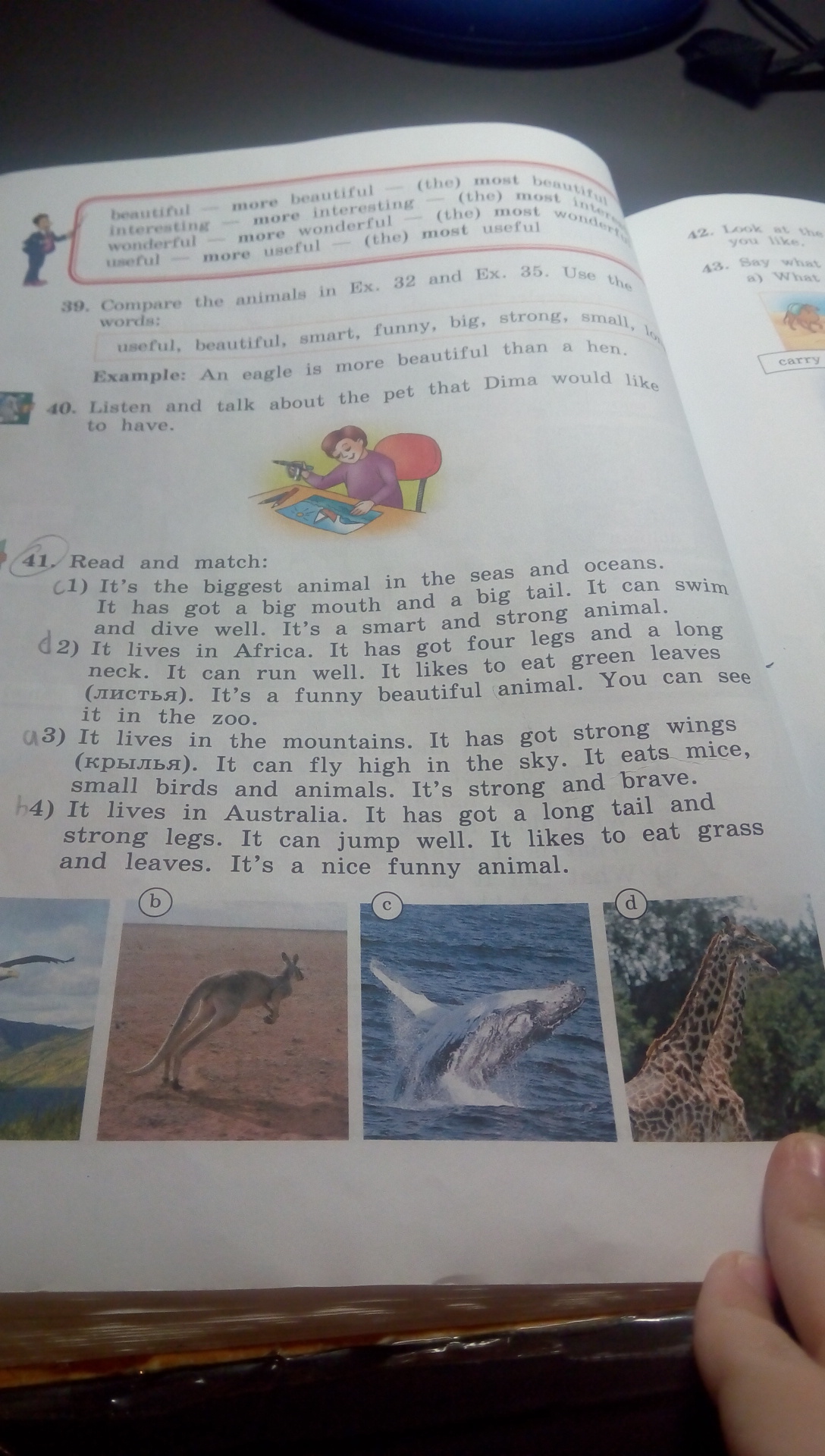 4. Оно живет в Австралии. У него длинный хвост и сильные ноги. Оно хорошо прыгает. Оно любит есть зеленые листья. Оно хорошее и смешное животное.