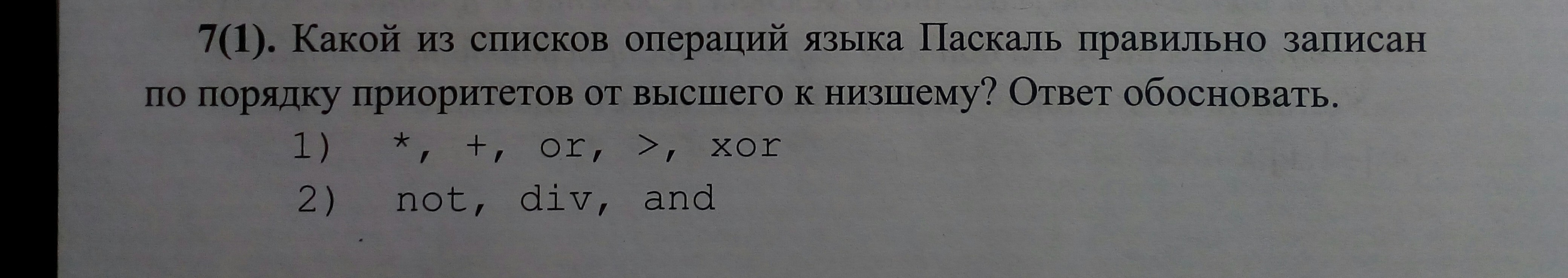 Какой из списков операции языка Паскаль правильно записан по порядку приоритетов от высшего к низшему!?ОТвет обосновать