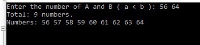 Даны два целых числа A и B (A < B). Найти все целые числа, расположенные между данными числами (включая сами эти числа), в порядке их возрастания, а также количество N этих чисел. На языке С++