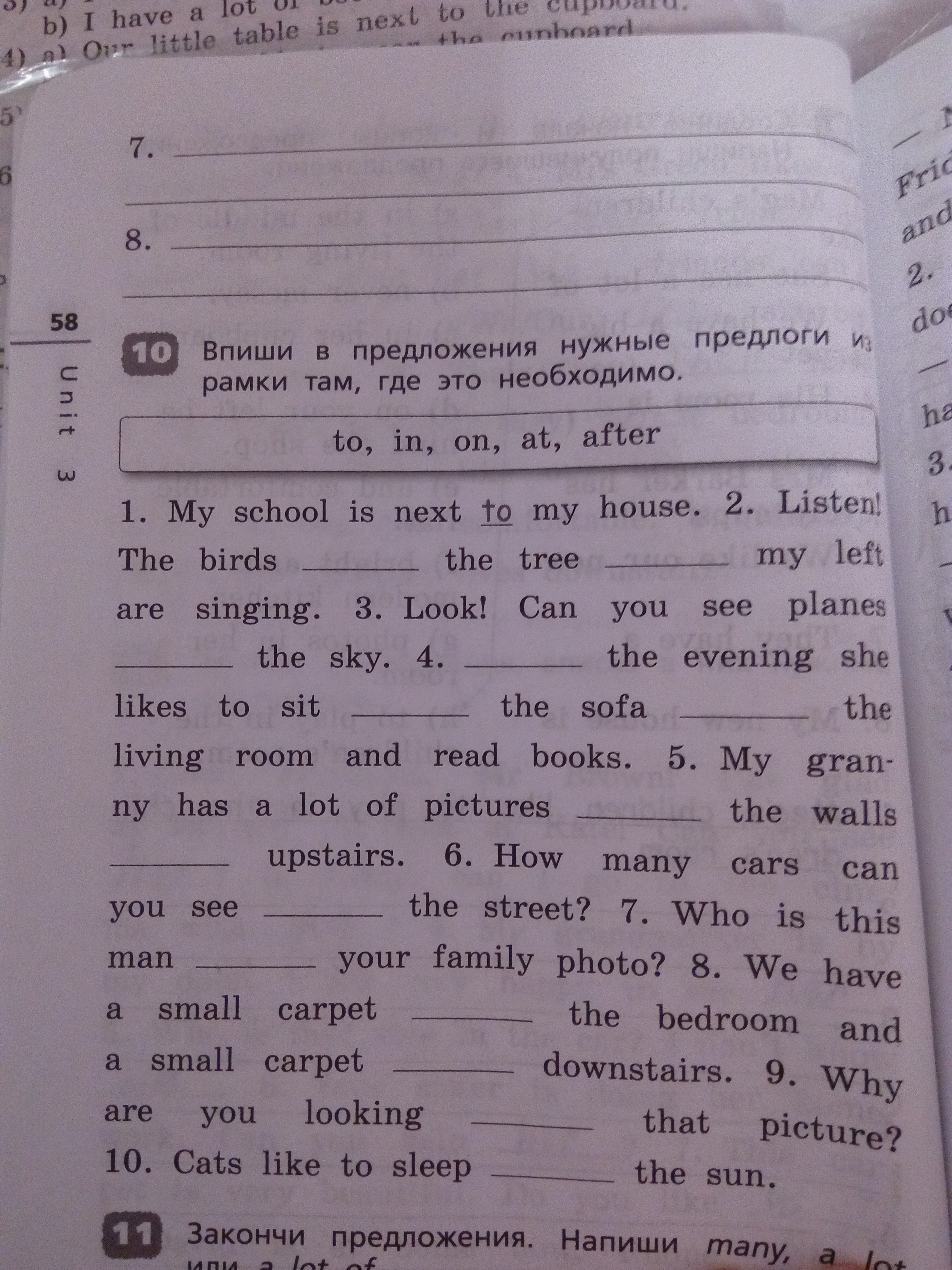 2. Listen! The birds on the tree at my left are singing. 3. Look! Can you see planes on the sky. 4. At the evening she likes to sit on the sofa in the living room and read books. 5. My granny has a lot of pictures on the walls in upsteirs. 6. How many cars can you see on the street? 7. Who is this man on your family photo? 8. We have a small carpet in the bedroom and a small carpet on downstairs. 9. Why are you looking at that picture? Cats like to sleep in the sun.