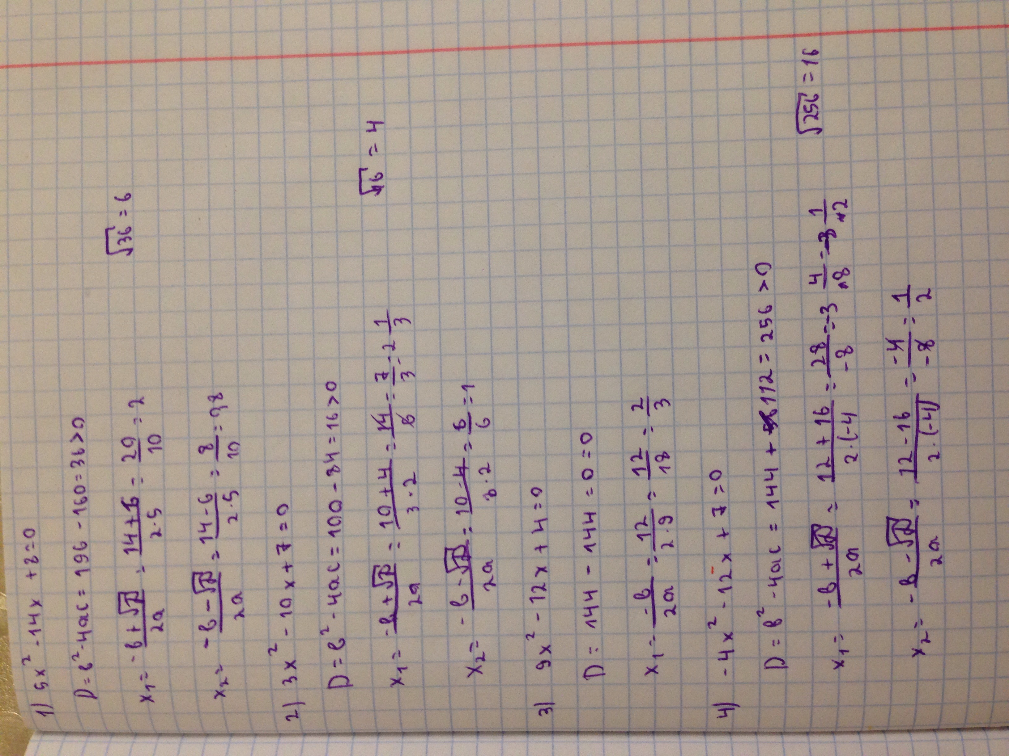 1) 5x² - 14x + 8 = 0; 2) 3x² - 10x + 7 = 0; 3) 9x²- 12x + 4 = 0; 4) -4x²-12x+7=0.