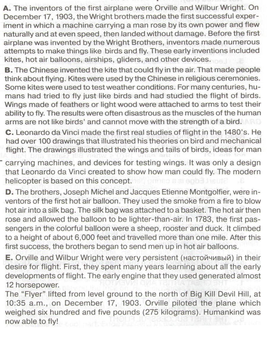 Изобретатели первого самолета были Орвилл и Уилбур Райт. 17 декабря 1903 года братья theWright сделал первый успешный EXPER MENT, в которой машина проведения Амана розы своей собственной силой и полетела естественно andateven скорость, а затем приземлился без повреждений. Перед первым самолетом была изобретена братьями Райт, авторы предпринимали многочисленные попытки сделать вещи IKE птиц andfly. Theseeary изобретения включены воздушные змеи, горячие воздушные шары, дирижабли, планеры и другие устройства B. Китайцы изобрели воздушный змей, который мог Flyin воздух. Это заставило людей думать о полете. Змеи были использованы китайцами в религиозных церемониях. Некоторые воздушные змеи были использованы для проверки погодных условий. На протяжении многих веков, гу- Ман пытался летать так же, как птицы и изучал полет птиц крылья из перьев или светлого дерева были прикреплены к оружию, чтобы проверить их способность летать. Результаты были часто катастрофические последствия, как мышцы человеческих рук не как птицы »и не может двигаться с силой птицы С Леонардо да Винчи сделал первые реальные исследования flightin 1480-х. У него было более 100 рисунков, иллюстрирующие его теорию на птицу и механического полета. Чертежи проиллюстрированы крылья и хвосты птиц, идеи для человека, несущего машин и устройств для тестирования крыльев. л был только дизайн, что Леонардо да Винчи создал, чтобы показать, как человек мог летать. Современный вертолет базируется на этой концепции Д. братьев, Джозеф Мишель и Жак Этьен Монгольфье, были в entors первого воздушном шаре. Они использовали дым от пожара дуть горячий воздух в silkbag. Thesilk сумка была прикреплена Тоа корзины Затем горячий воздух поднялся и позволил воздушный шар, чтобы быть легче, чем воздух в 1783 году, первые па Sengers в красочном воздушном шаре были овцы, петух и утка. Он поднялся на высоту около 6000 футов и проехал более одной мили. После этого первого успеха, братья начали посылать людей в воздушных шарах E. Орвилл и Уилбур Райт были очень настойчивы (настойчивый) в своем стремлении к полету. Во-первых, они потратили много лет изучения всех ранних разработок полета. Ранний двигатель, который они использовали генерироваться почти на 12 лошадиных сил. "Флаер" снят с уровня земли к северу от Большого Kill Devil Hill, в 10:35 утра 17 декабря 1903 года Орвилл пилотировал самолет, который весил шестьсот пять фунтов (275 кг). Человечеству теперь умеет летать!