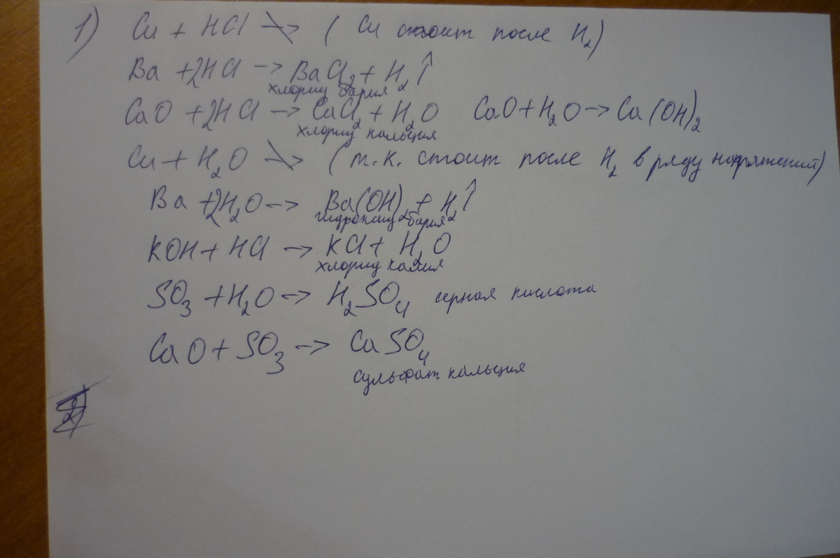 1.даны вещества: медь, соляная кислота, барий, оксид кальция , вода, гидроксид калия, оксид серы( VI). Какие из этих веществ будут взаимодействовать между собой ? напишите уравнение возможных реакций и укажите названия получающихся веществ. 2. зная что магний- металл составьте генетический ряд его соединений и дайте названия его членам. определите класс веществ к которым они принадлежат.