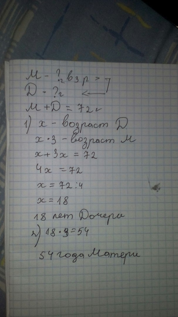 сумма возрастов матери и дочери 72-м. возраст матери в 3 раза больше возраста дочери. сколько лет дочери и матери