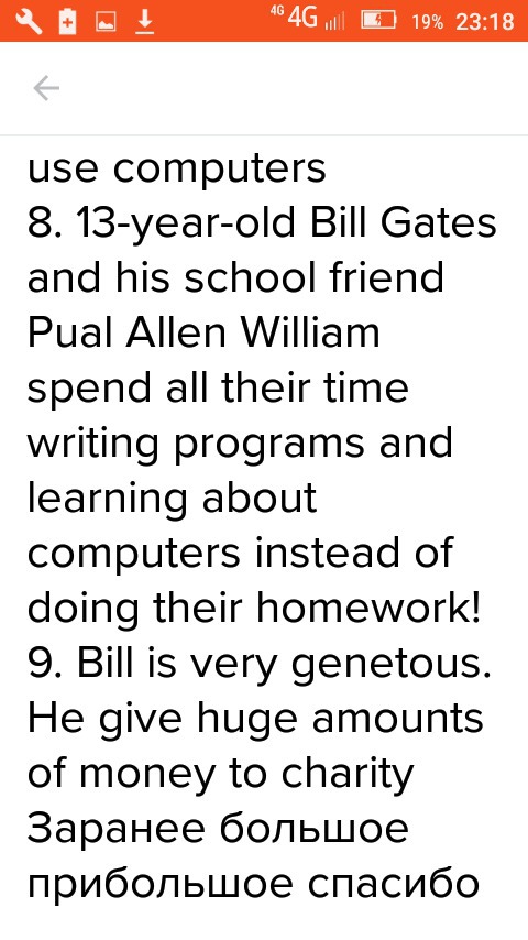 Bill Gates is 13 years old. His school friend name is Pual Allen William. They spend all time. They write programs and learn about computer instaled. They do theirs homework.
