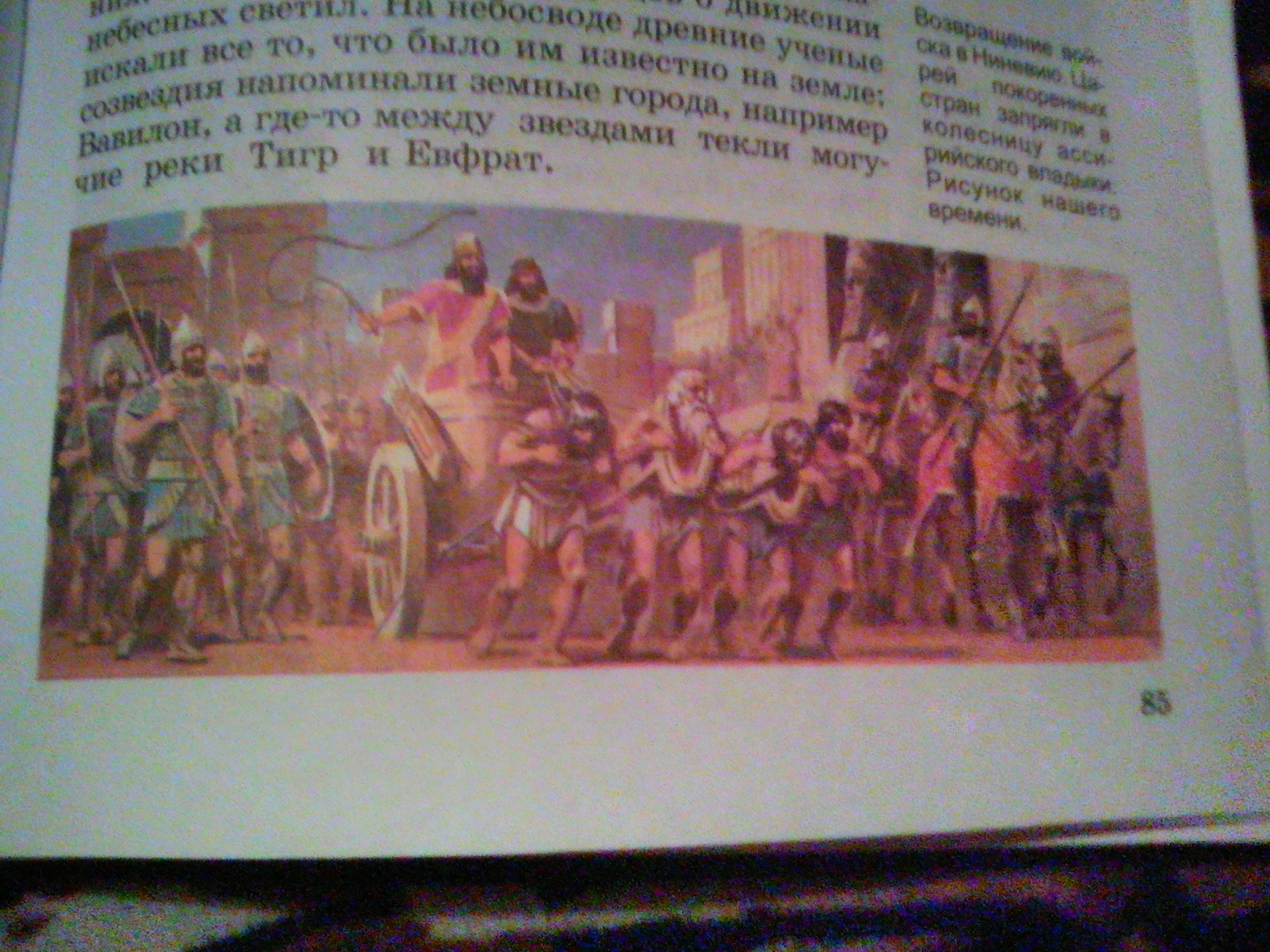 на картине изображено как царь едет на колеснице. эта колесница за преженна рабами. а по бокам слуги которые служат и защищают царя. как на картине видно что царь куда то спешит. вокруг них пар. значит что там была битва. вот по этому он спешит. а еще он хлестом бьет своих рабов. что бы по быстрее прийти до своего царства. и там спрятаться. и не выходить.