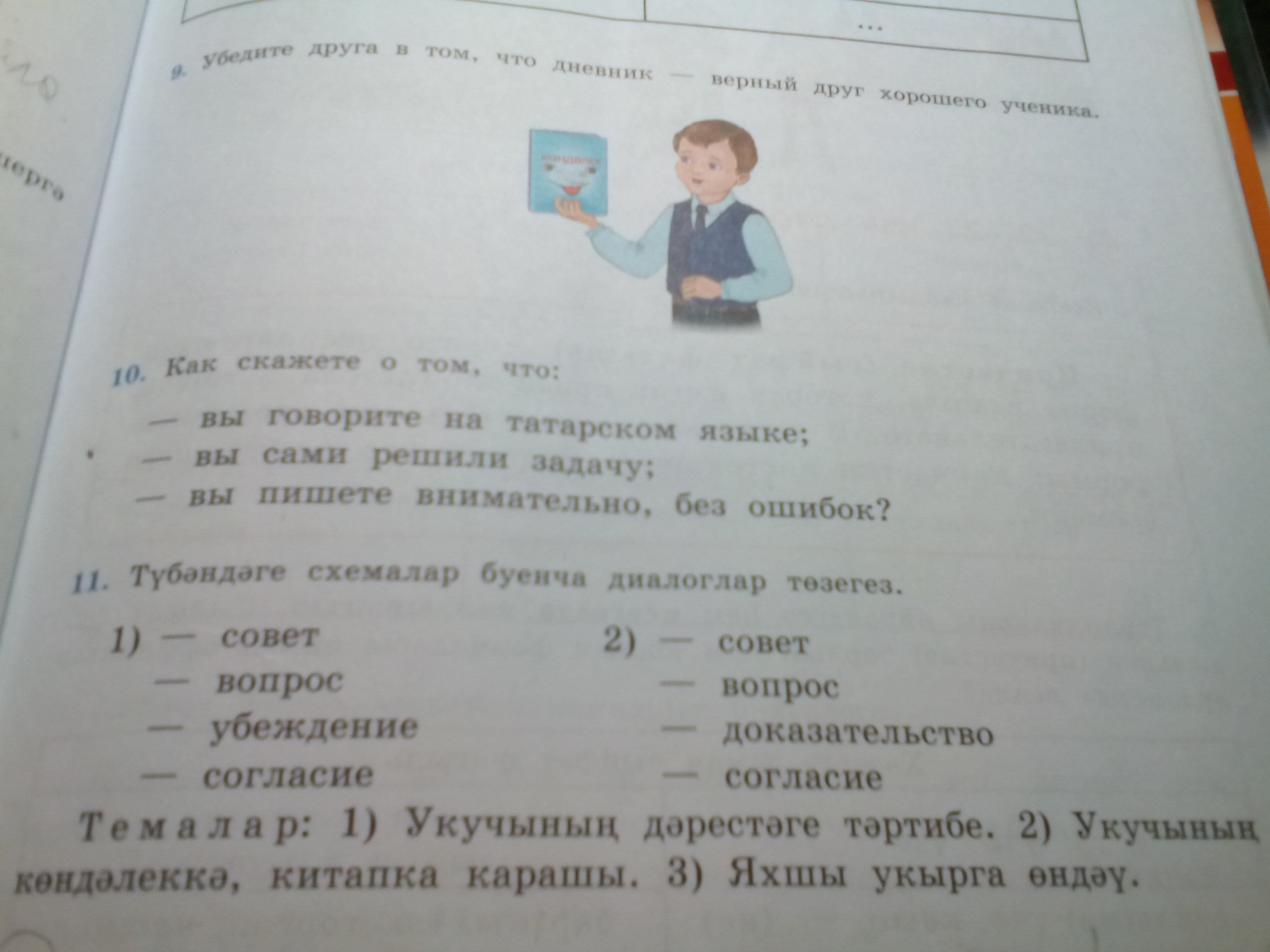 1 Син мэктэптэ узенне яхшы тот,тэнэфеслэрдэ чапма,укутцчы апакны тынла,сугышма.Китапларны йормагыз. Син тэртипле укучы мы.Эйе мин тэртипле укучы гел апаны тынлыйм,тэнэфеслэрдэ сугышмыйм,чапмым.