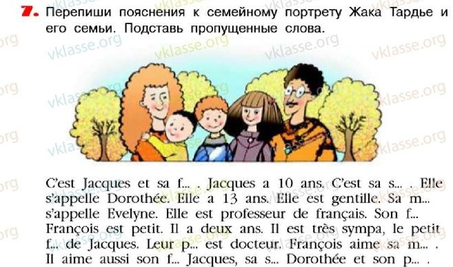 Это Жак и его семья(famille). Жаку 10 лет. Это его сестра(soeur). Ее зовут Доротея. Ей 13 лет. Она милая. Его маму(mère) зовут Эвелин. Она учитель французского языка. Его брат(frère) Франсуа маленький. Ему два года, он очень симпатичный, маленький брат (frère) Жака. Их отец (père) доктор. Франсуа любит свою маму(mère). Он любит также своего брата(frère) Жака, свою сестру(soeur) Доротею и своего папу(père).