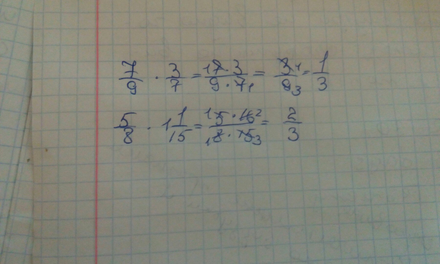 б) 7/9 * 3/7 = 7*3/9*7 = 1/3
