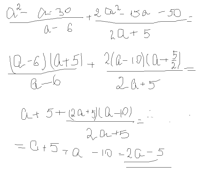 Упростите выражение : дробь a^2-a-30 деленное 0,5a-3 прибавить ( дробь ) 2a^2-15a-50 деленное на 2a+5 Помогииите пожалуйстаа! И как можно побыстрее Очееень надооо!