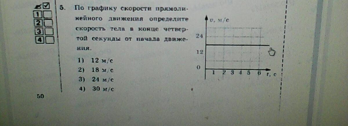 По графику скорости прямолинейного движения определите скорость тела в конце четвёртой секунды от начала движения.