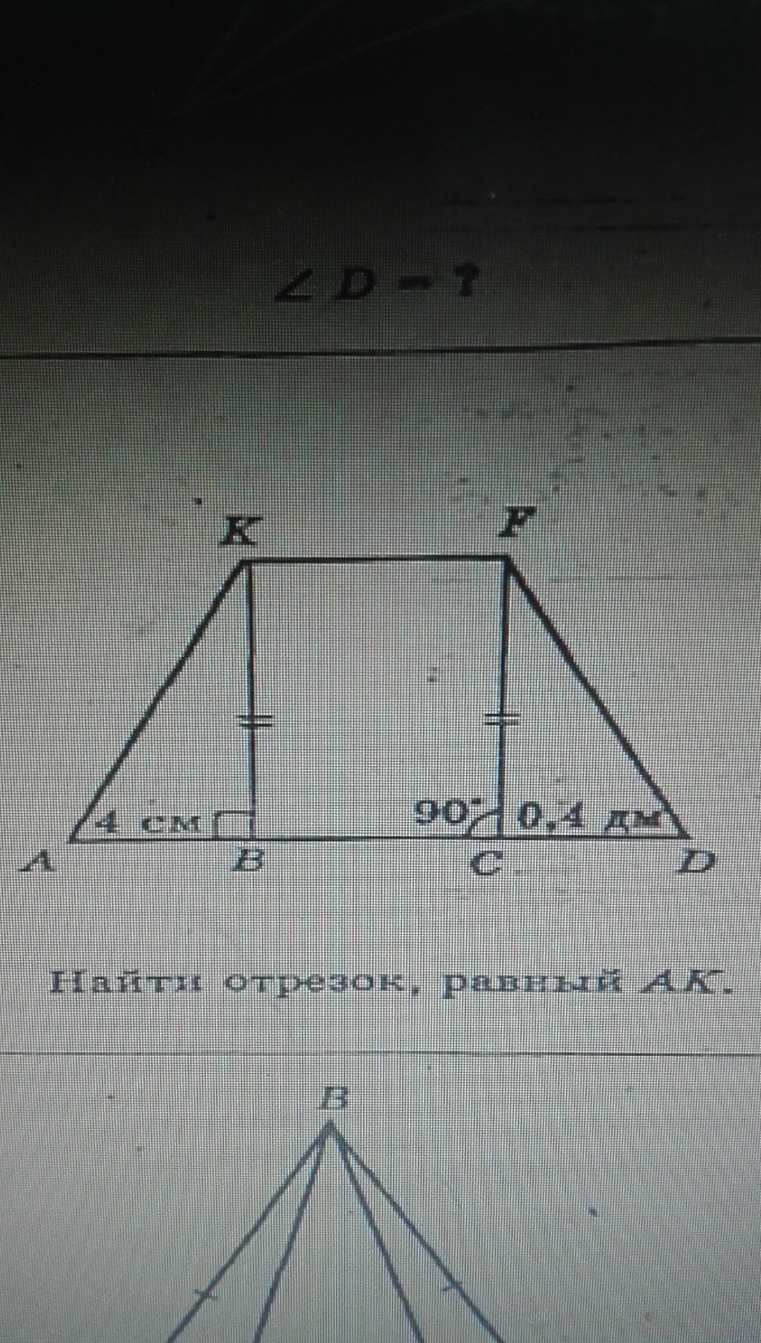 КВ=FC, 0,4 дм=4см ⇒ AB=CD , ∠ABK=∠FCD ⇒